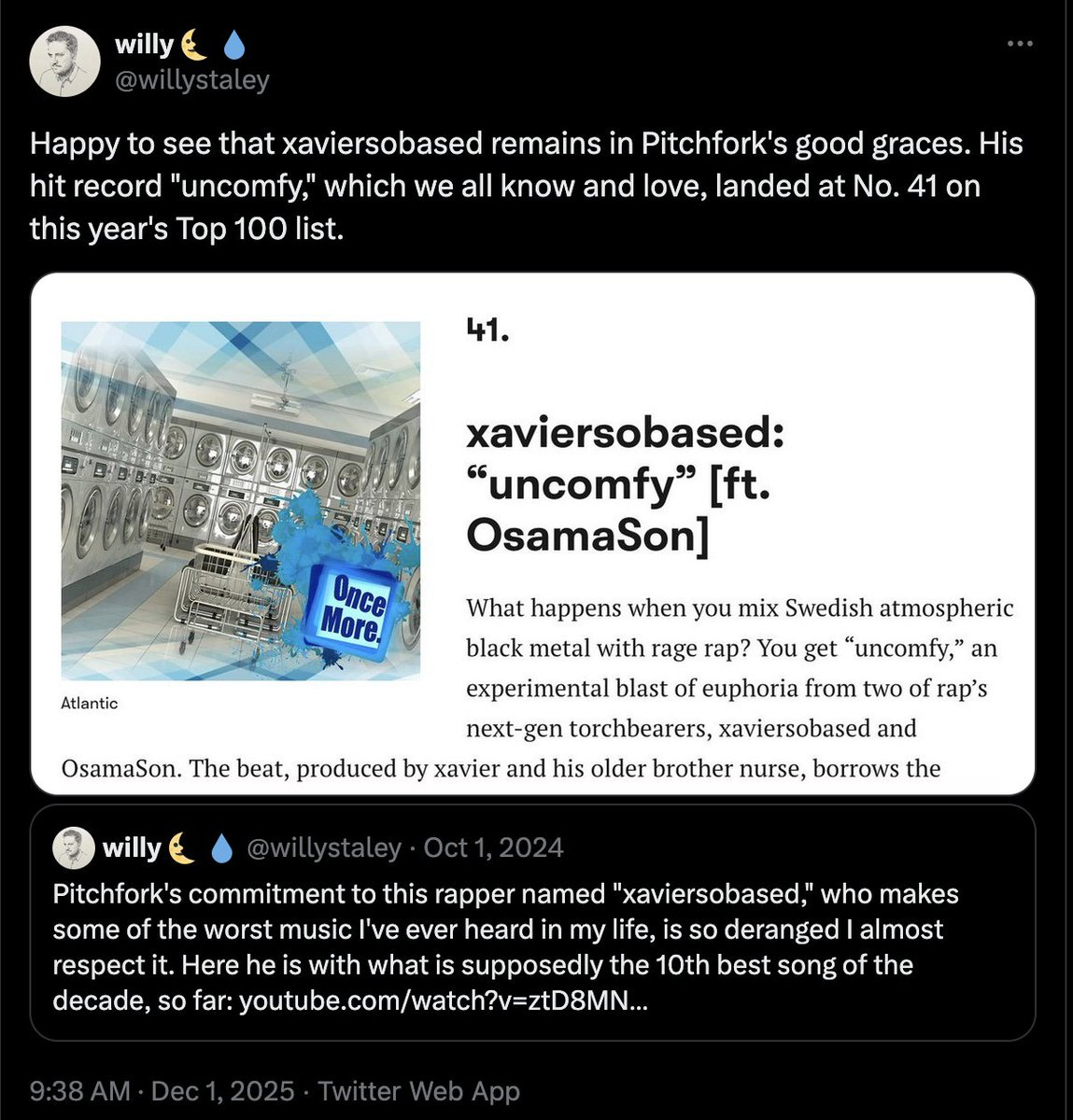 To state the very obvious: Not everybody in my age bracket shares my love of Xaviersobased. If you’re a greying critic, there are fewer easier ways to run up engagement than by dunking on Xaviersobased. There’s one guy on Twitter who sincerely seems to believe that Pitchfork’s interest in Xaviersobased is an elaborate troll job. A few weeks ago, another legacy music critic (who I won’t call out by name because to his credit he deleted the tweet) dismissed Xaviersobased as “heavily auto-tuned music for teenagers to play out of phone speakers.” To which I’d argue, what’s wrong with any of that? There’s something about Xaviersobased that turns once open-minded rap lovers into cranky ’80s dinner-table dads muttering “more like crap music.”